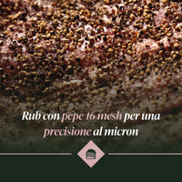 Derivato da grani interi di pepe nero, spezzati esattamente in quattro frammenti e successivamente depolverizzati. Una lavorazione precisa che garantisce un rilascio aromatico costante e uniforme durante le lunghe cotture. La grana 16 mesh rappresenta l’equilibrio ideale tra intensità e raffinatezza.